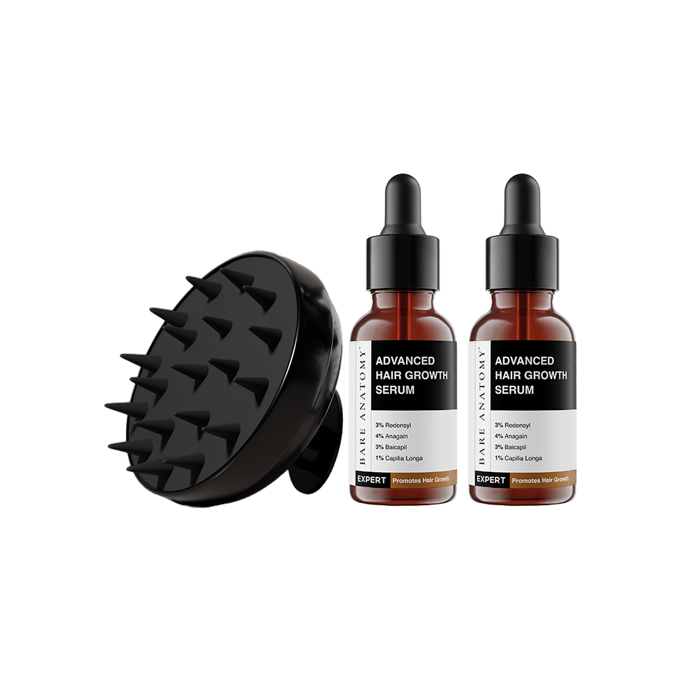This Bare Anatomy combo combines the Advance Hair Growth Serum and Scalp Massager to accelerate hair growth and deliver stronger, healthier strands. Formulated with 3% Redensyl, 4% Anagain, Rosemary, and Rice Water, the lightweight, non-greasy serum penetrates deep into the scalp to stimulate follicles and promote 214% healthy hair growth in just 10 days. Paired with the Scalp Massager, which boosts blood circulation and enhances serum absorption, this duo works together to maximize the delivery of active ingredients to the hair follicles.